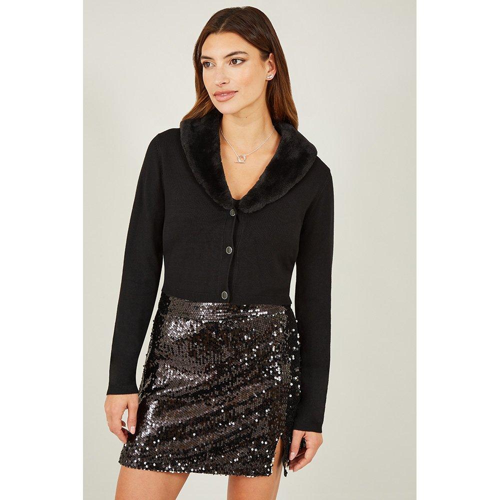 Layer up your party look with this black bolero style cardigan from Yumi, With a fitted shape that is cropped at the waist, popper buttons and a gorgeous faux fur collar that can be detached. This soft and lightweight knit is perfect for dressing up for fancy events. Size reference, Small 8-10, Medium 10-12, Large 12-14.