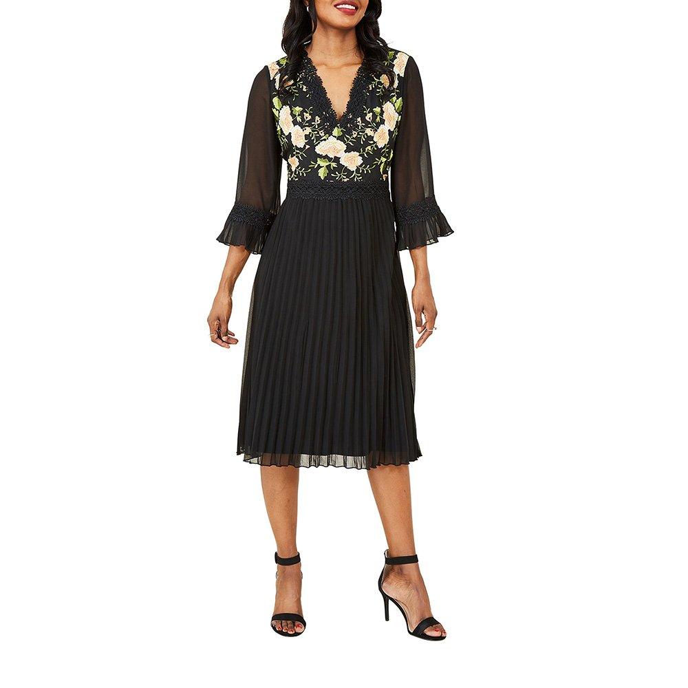 A perfect balance of vintage and contemporary style, this midi dress is apt for parties. Crafted from lightweight fabric, it's styled with a pleated skirt and a floral bodice decorated with lace inserts. Fluted sleeves add a retro feel.