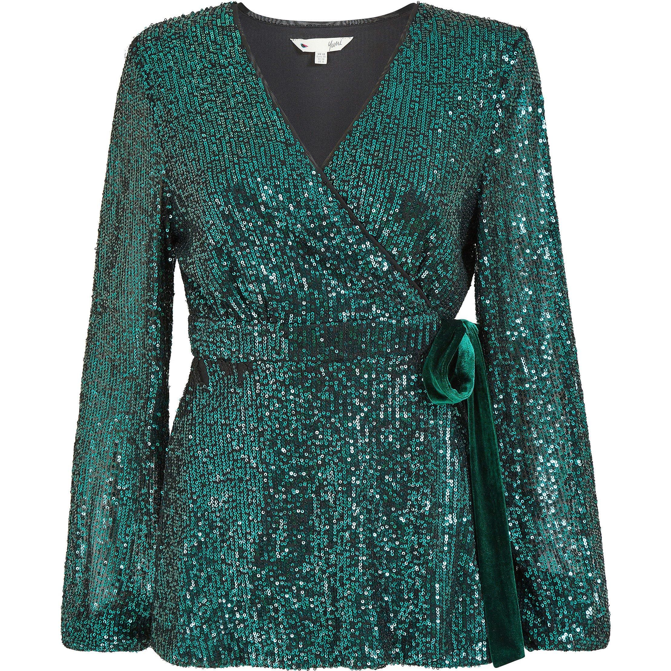 The Yumi Sequin Velvet Tie Wrap Top features structured detailing across the bodice with a velvet tie closure. This piece pairs texture with a wrap design for defined shape.