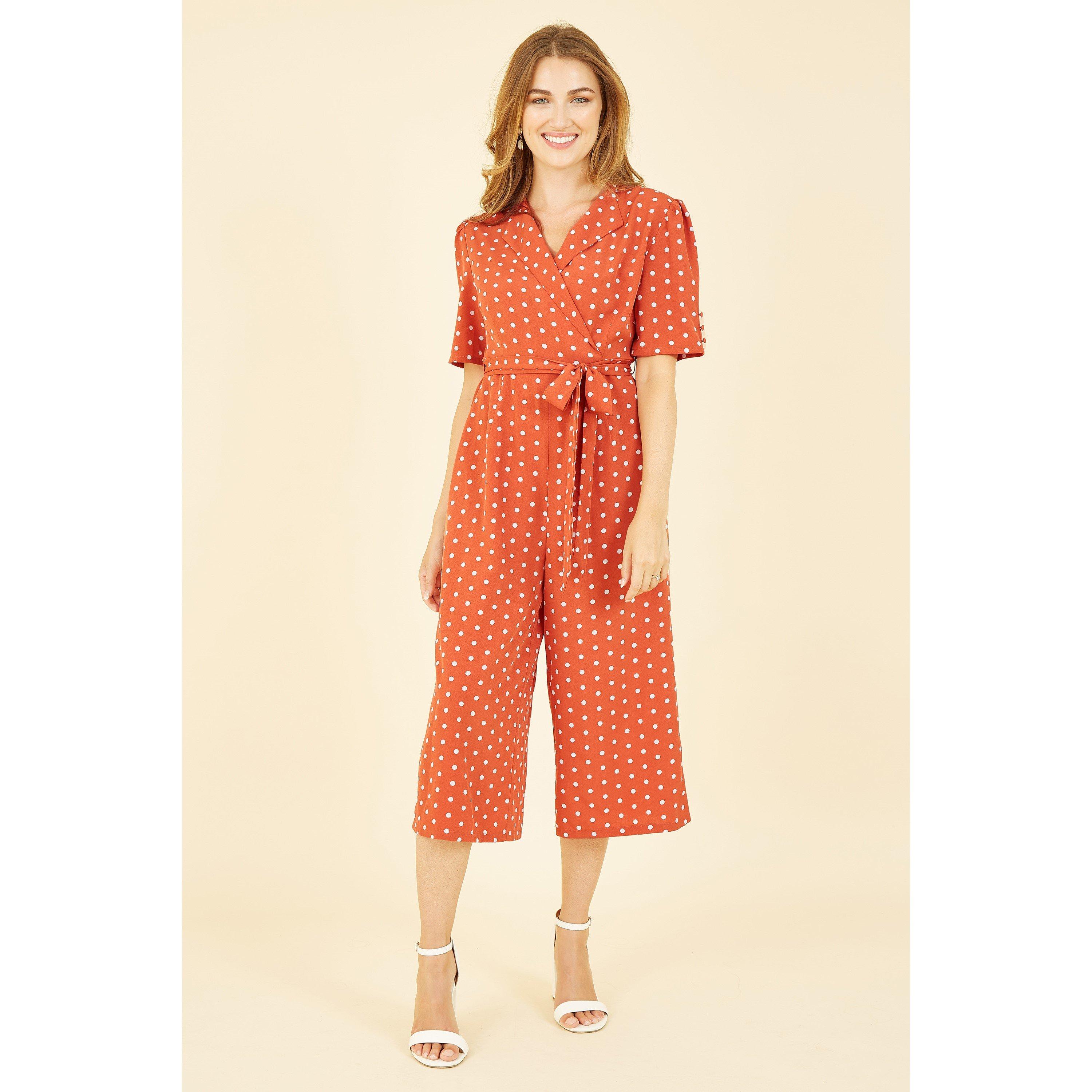 The elbow length sleeve and wide lapel on the wrap around collar really give this jumpsuit its retro feel. The orange polka dot feels fresh and summery, with the culotte style leg giving it a comfortable fit. Style with trainers to give modern retro style a go this season.