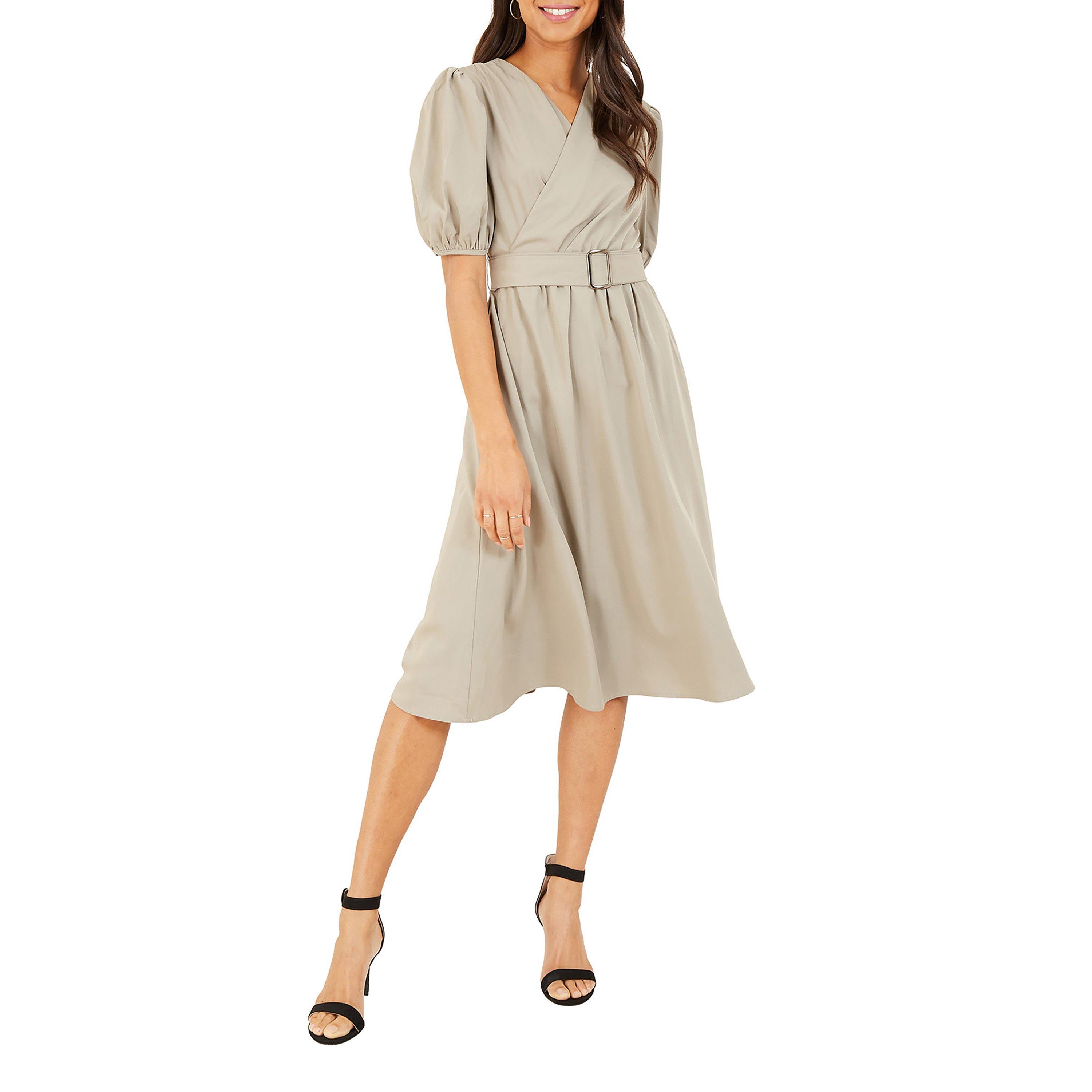 In a refined tea silhouette, this midi dress boasts a smart palette for added appeal. Defined with a neat belt and puff sleeves, it is made for refined evenings and special events