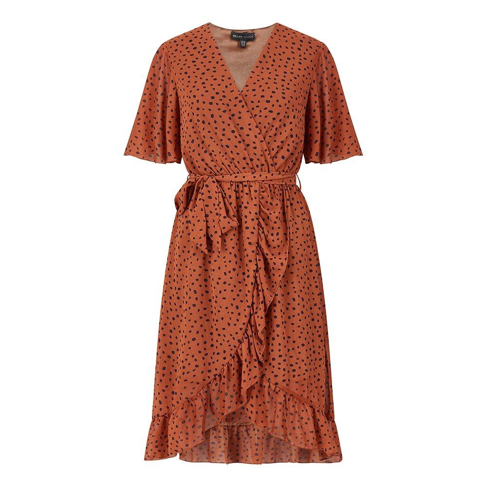 Cut a stylish shape in this wrap dress from Mela. Featuring a classic cut with short sleeves and a tie waist, it's refreshed with ruffles running from the shoulder to the hemline. It's complete with a modern dash print.