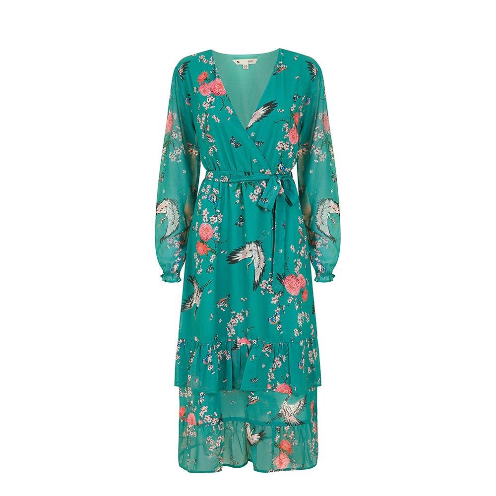 Yumi's Crane Print Midi Wrap Dress brings together draping and nature-inspired artistry. The flattering wrap shape creates a classic profile accentuated by the vibrant crane motif.
