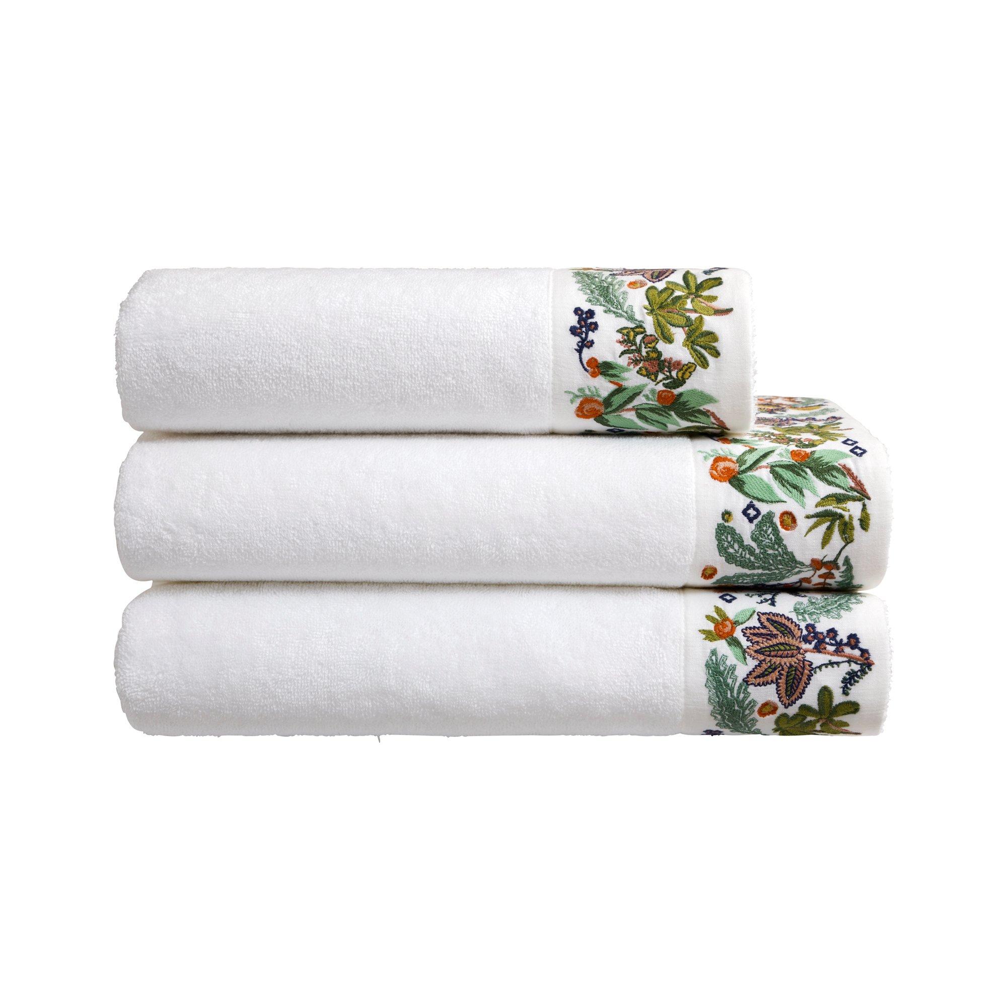 A chic towel design by Yves Delorme, perfect for reflecting the current season, be it spring or summer. Crafted from supple and soft organic cotton blend in white, the towel is embroidered with a stripe of vivid floral motifs along the edge. The rest of the design remains simple and white, creating a perfectly balanced look. 83% Organic Cotton 17% Modal