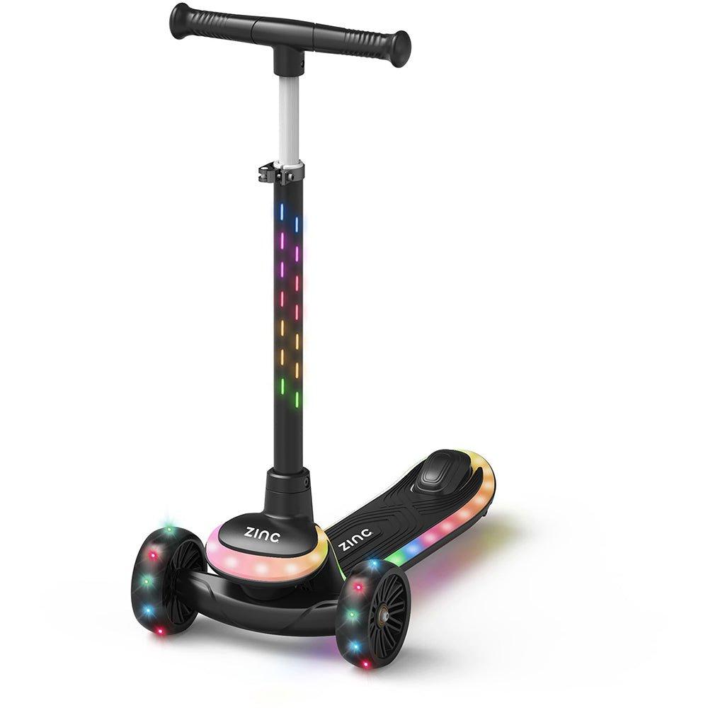 Bring fun and safe scooting to life with the Zinc Three-Wheeled Folding LED Scooter. LED deck lights up in 20 colours, while battery-free wheels add extra sparkle. Adjustable handlebars grow with the child, and lean 'n' steer control with three wheels and a rear brake ensures stability. Nearly fully assembled, it's easy to store and transport.