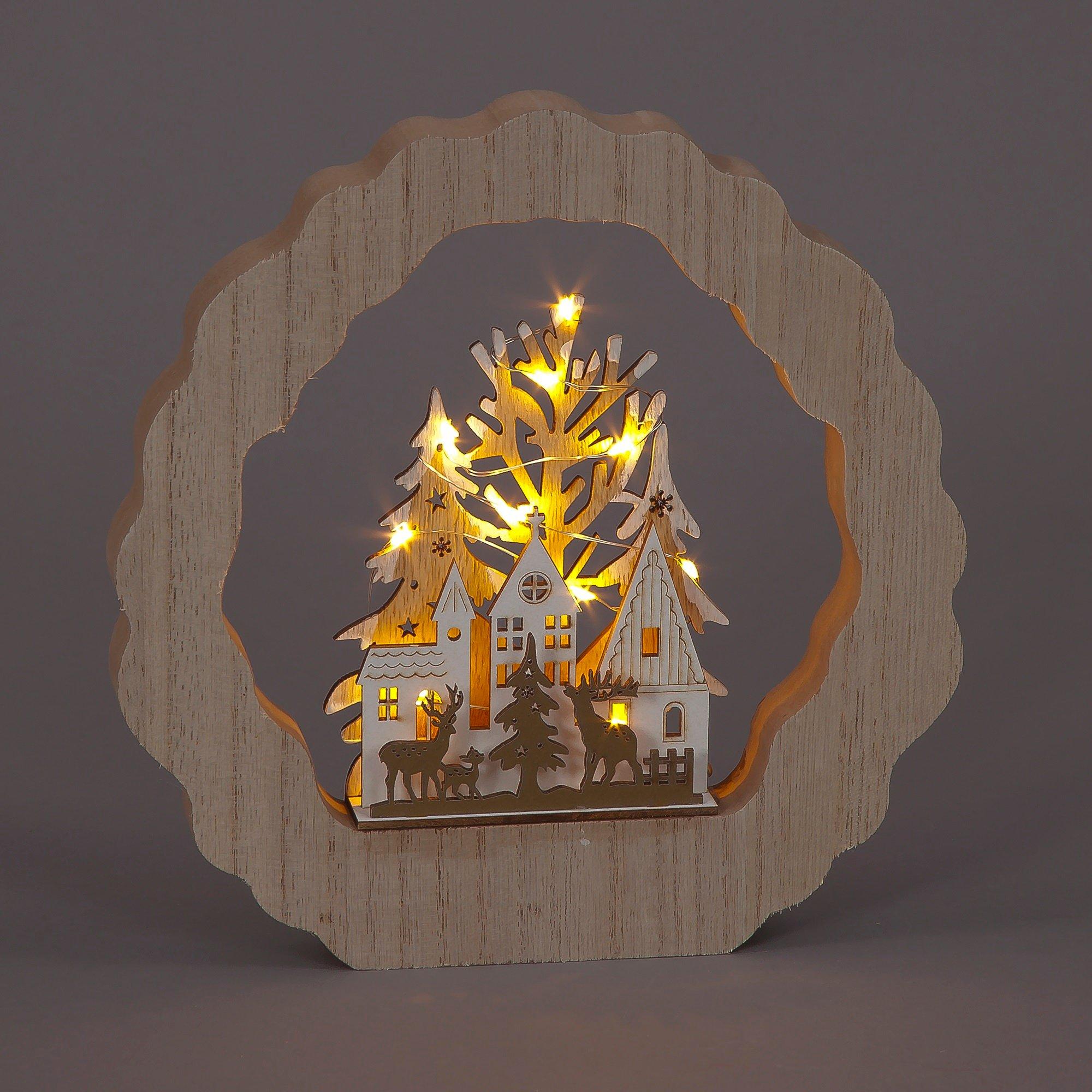 LED Lit Framed Carved Wood Village with Deer Scene