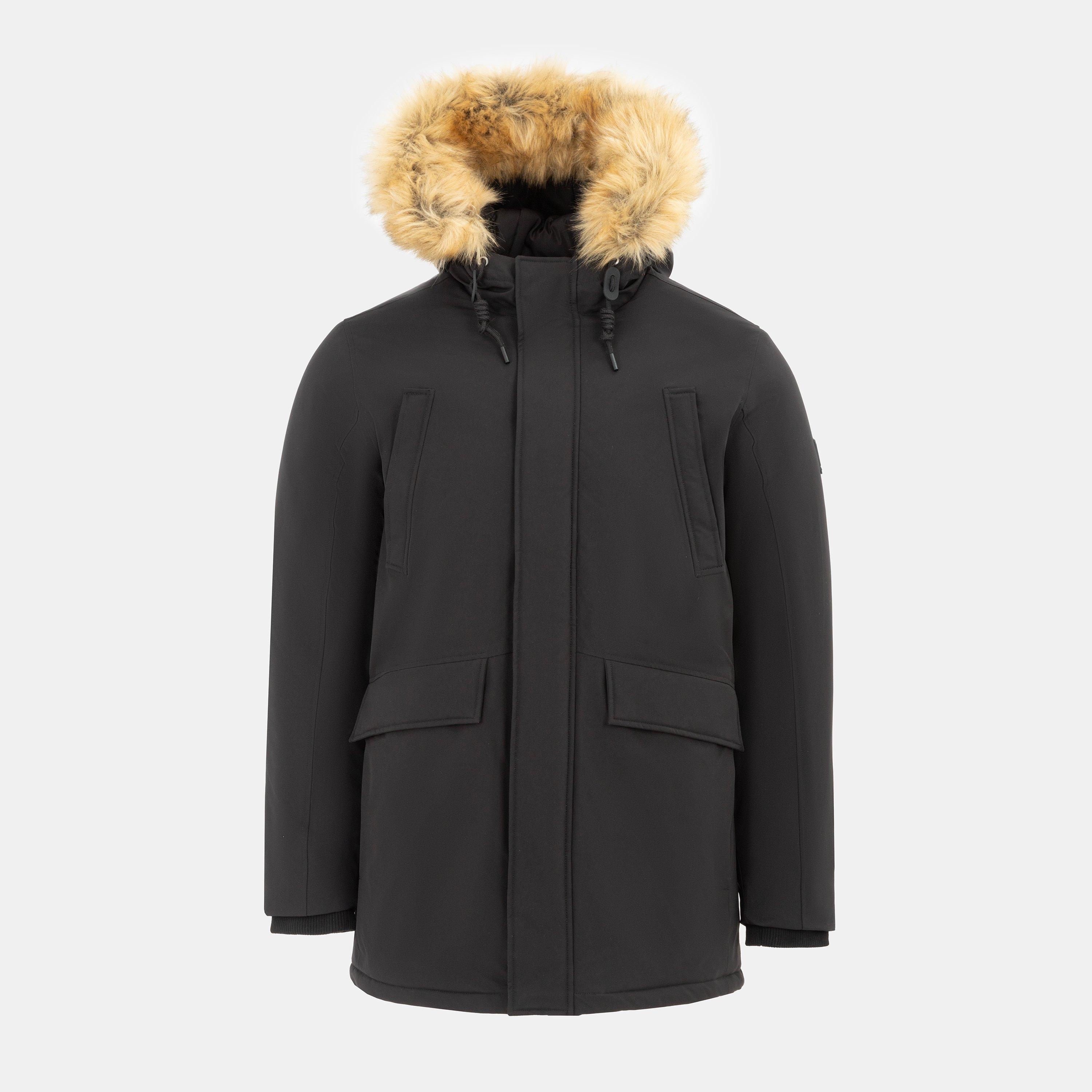 Rebellious mod style gets a contemporary update in our range of men's black parka coats. On crisp mornings, pull on a thick padded design with a soft lining before stepping outside. Printed inner fabrics and contrasting fur-trimmed hoods have a retro-inspired aesthetic. Diagonal or horizontal pockets with protective flaps add the finishing touches to these classic British designs, including brands like Barbour. Layer one of our black parka coats over a Birdseye t-shirt and jeans, then complete your laid-back attire with suede desert boots. A men's black parka is the ultimate staple for staying warm while keeping your look effortlessly stylish.