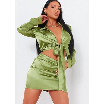 Woven Shirred Back Tie Front Crop Top