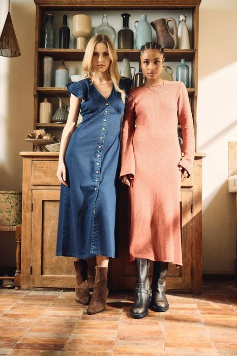 Take denim beyond jeans and give it a fresh spin with a denim dress. Whether styled like a classic shirt dress, a fitted mini, or a zip-front pinafore, denim adds structure and cool-girl attitude. Perfect for transitional weather, this piece works across seasons with the right accessories.