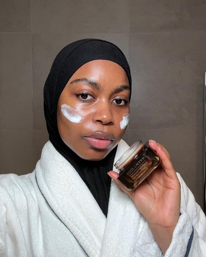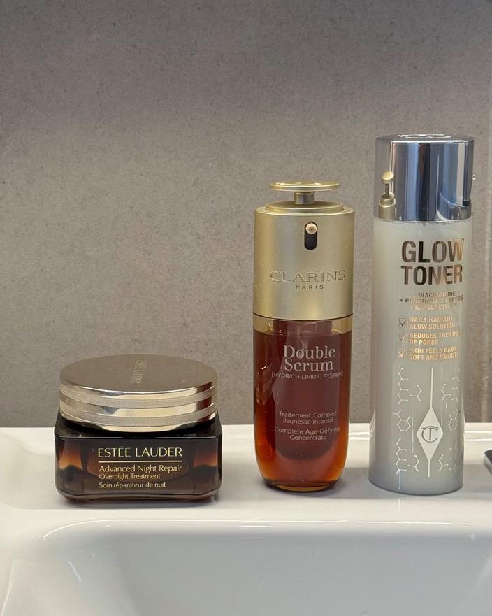 In the morning, I like to look more glowy so I use products that give me more of a glass skin effect with sunscreen to finish it off. My evening routine is a little heavier so that my skin can replenish itself overnight. I like using the Estée Lauder night repair overnight treatment, my skin feels so plump after waking up!