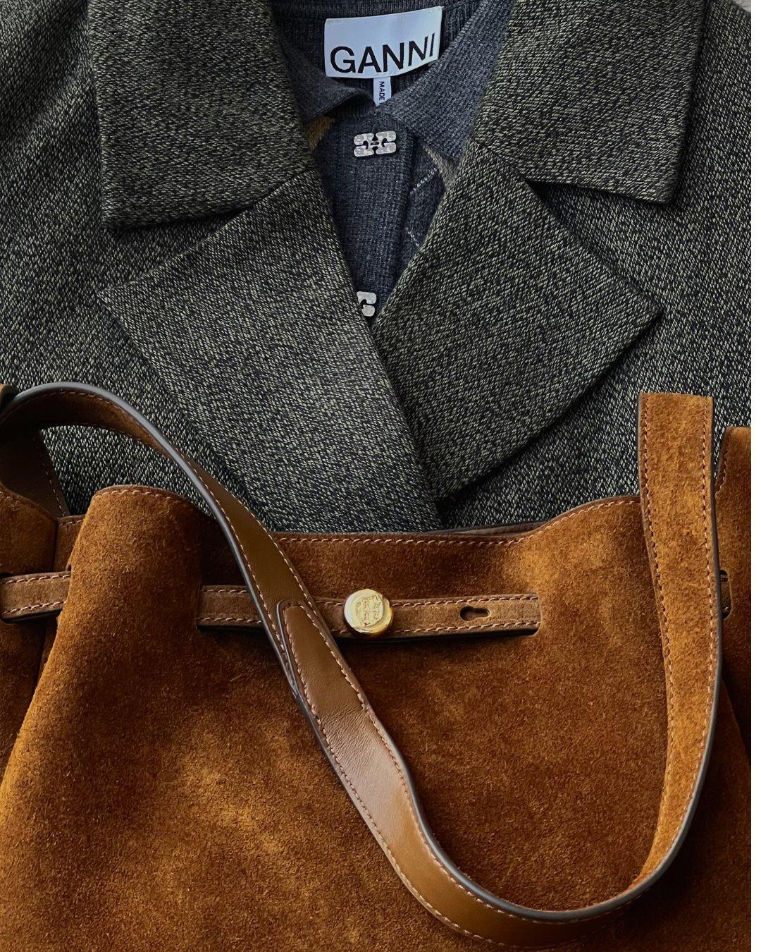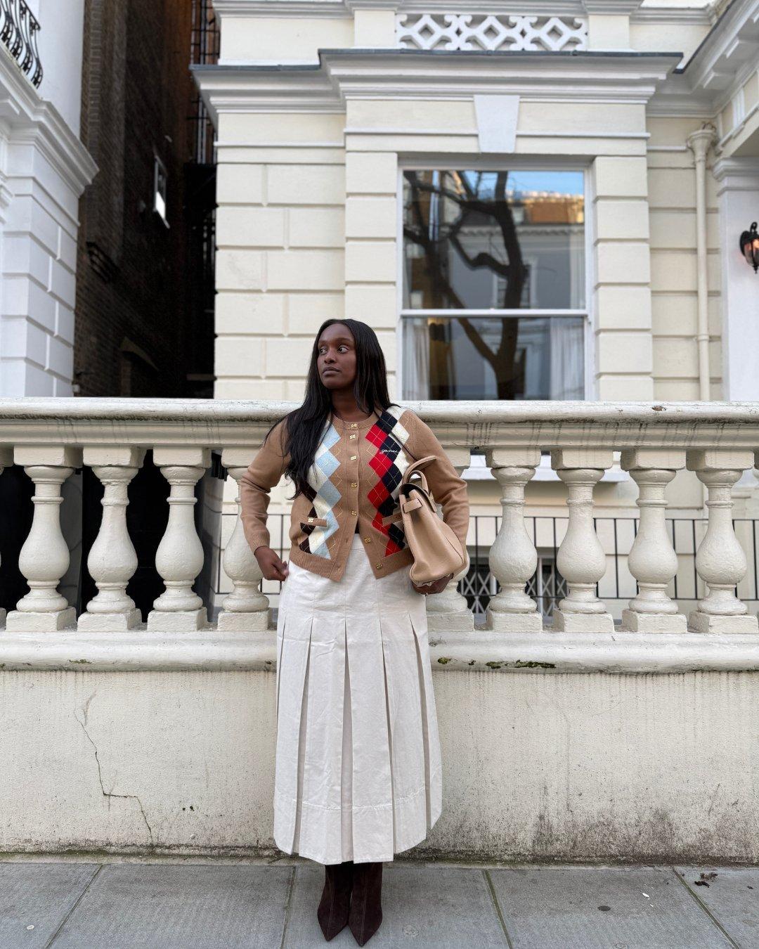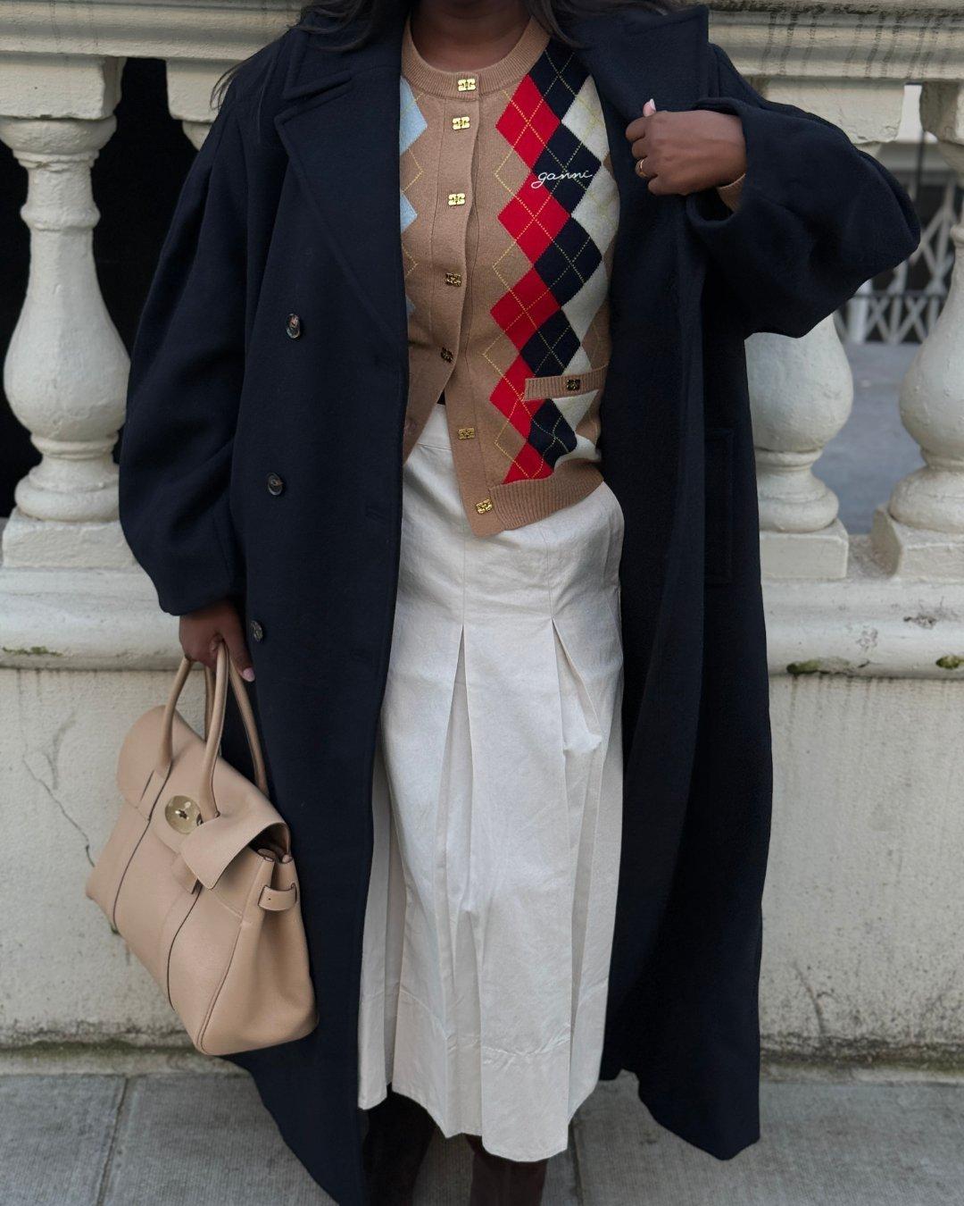 One of my favourite finds from Frasers has to be the ruched satin skirt from Ganni. It’s romantic, fluid, and just fun, the kind of piece that instantly brings interest to an office look. I styled it with a slouchy brown suede kitten-heel boot for a monochromatic finish that feels so chic with a midi skirt and a classic argyle fine-knit polo.