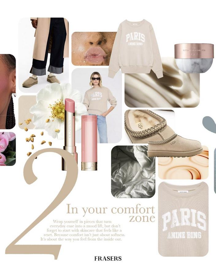 Wrap yourself in pieces that turn everyday ease into a mood lift. Start with skincare that feels like a reset, nourishing your skin and setting the tone for calm all day long. Rituals (the ritual of namaste) anti-ageing day cream deeply hydrates and boosts radiance with plant-based actives for supple, refreshed skin. Add a touch of home comfort with the UGG Tasman II slippers for cosy feet that feel as good as they look, and keep your lips soft and radiant with Clarins lip oil Balm, enriched with nourishing oils for long-lasting comfort and a subtle glow. Throw on the relaxed silhouette of Anine Bing’s Alec monogram hoodie to finish the look, effortless, snug and inherently uplifting. Because comfort isn’t just about softness. It’s about the way you feel from the inside out.