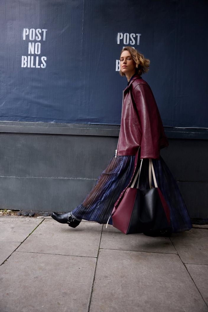 Choose a black leather trench coat or a burgundy trench coat and build the rest of the outfit around it. An all-black base keeps things balanced, while sleek boots and minimal accessories let the coat take focus.