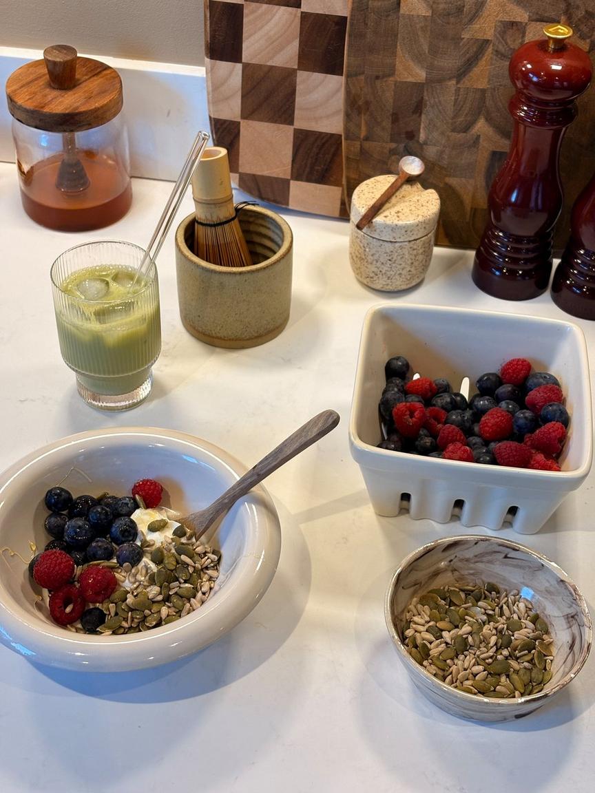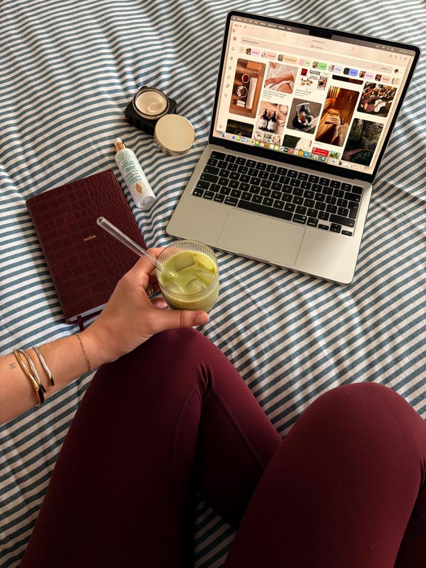 I try not to scroll on my phone as soon as I wake up, and on the weekends when I don’t need an alarm set, I leave my phone downstairs. Instead, I always have my kindle, notepad or my journal next to my bed. This allows me to read through my latest book, set intentions or write down notes that have been sitting in my brain. I always find that on the days where I don’t need to be on my phone or laptop too much, my brain and overall mood feels much brighter, so it’s something I’m really prioritising this year. I love coffee, but I know my body doesn’t respond well to drinking it first thing. I’ll have an iced matcha or hot tea with my breakfast or while I’m winding down post-workout as a slow caffeine release, and I take my supplements with a big glass of water. That way, I can save my coffee for an afternoon pick-me-up.