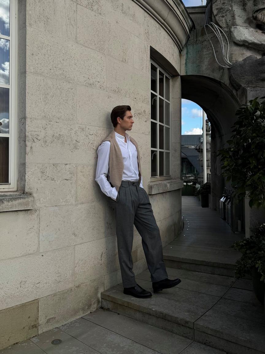 High-waisted grey pleated trousers paired with a crisp white shirt offer structure without stiffness. The knit draped over the shoulders softens the silhouette and adds depth without overheating: practical and stylish. It also means you’re covered if the temperature dips as the sun fades.