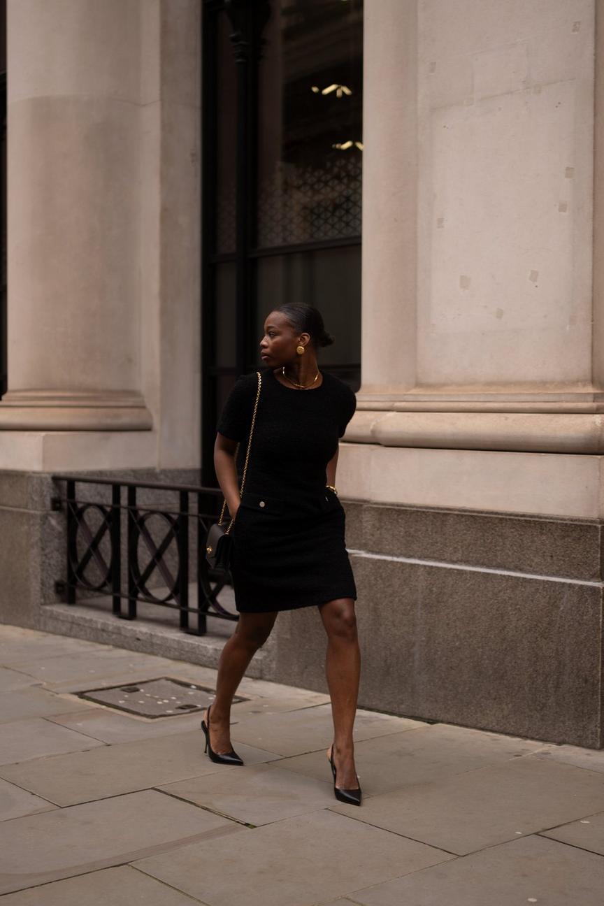The key here is softening the black. Gold jewellery adds warmth, while delicate heels keep things celebratory rather than corporate. For church ceremonies or formal venues, layer with a tailored blazer or lightweight trench, it instantly makes the look feel more occasion-conscious.