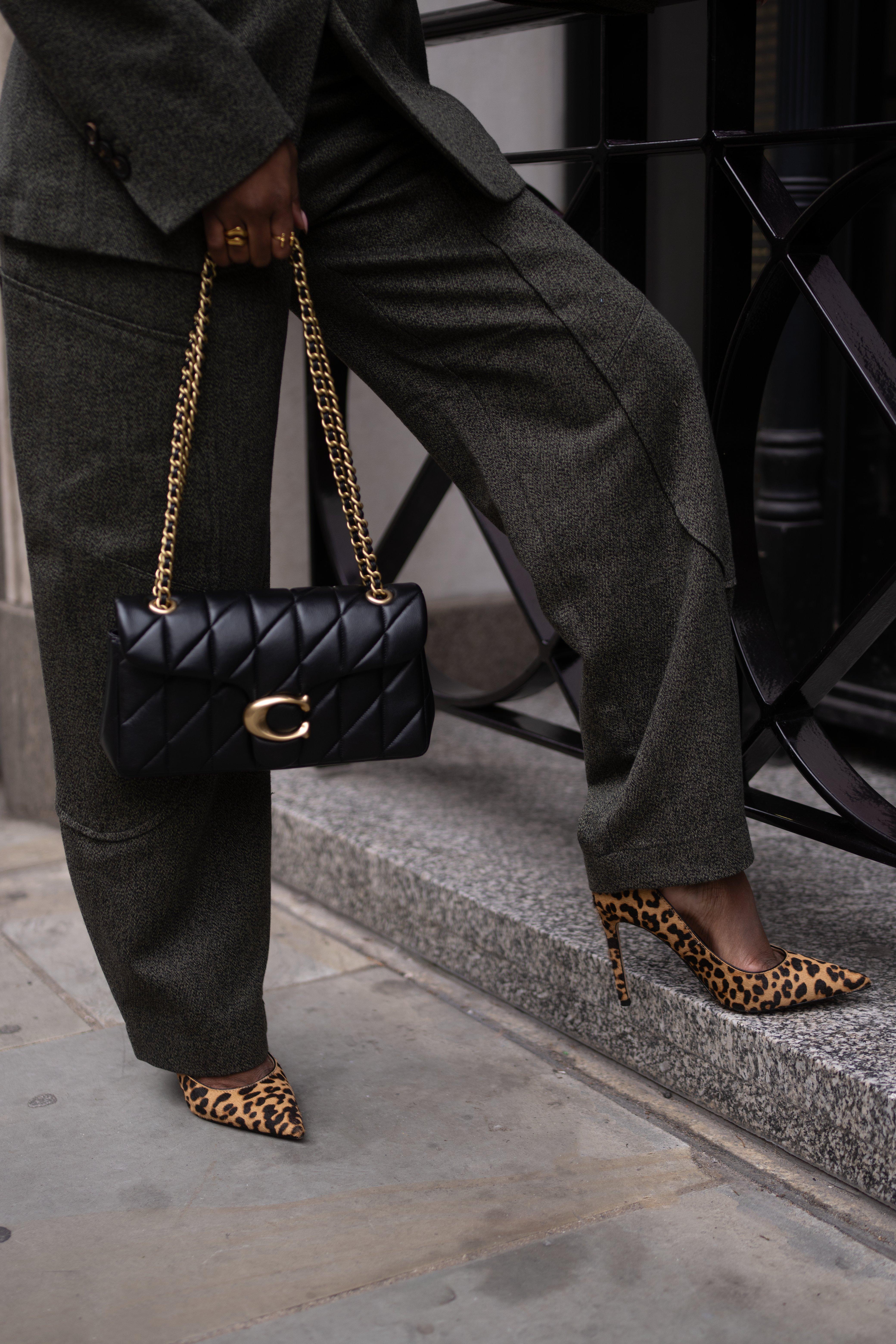 The Ganni suit does exactly that. The softer cut and earthy tone feel fresh against greenery, while still giving you structure. A simple camisole underneath keeps it light and breathable. Leopard-print heels add personality, but you could easily switch to a block heel or elegant flat if you’re navigating lawns.