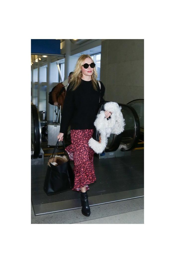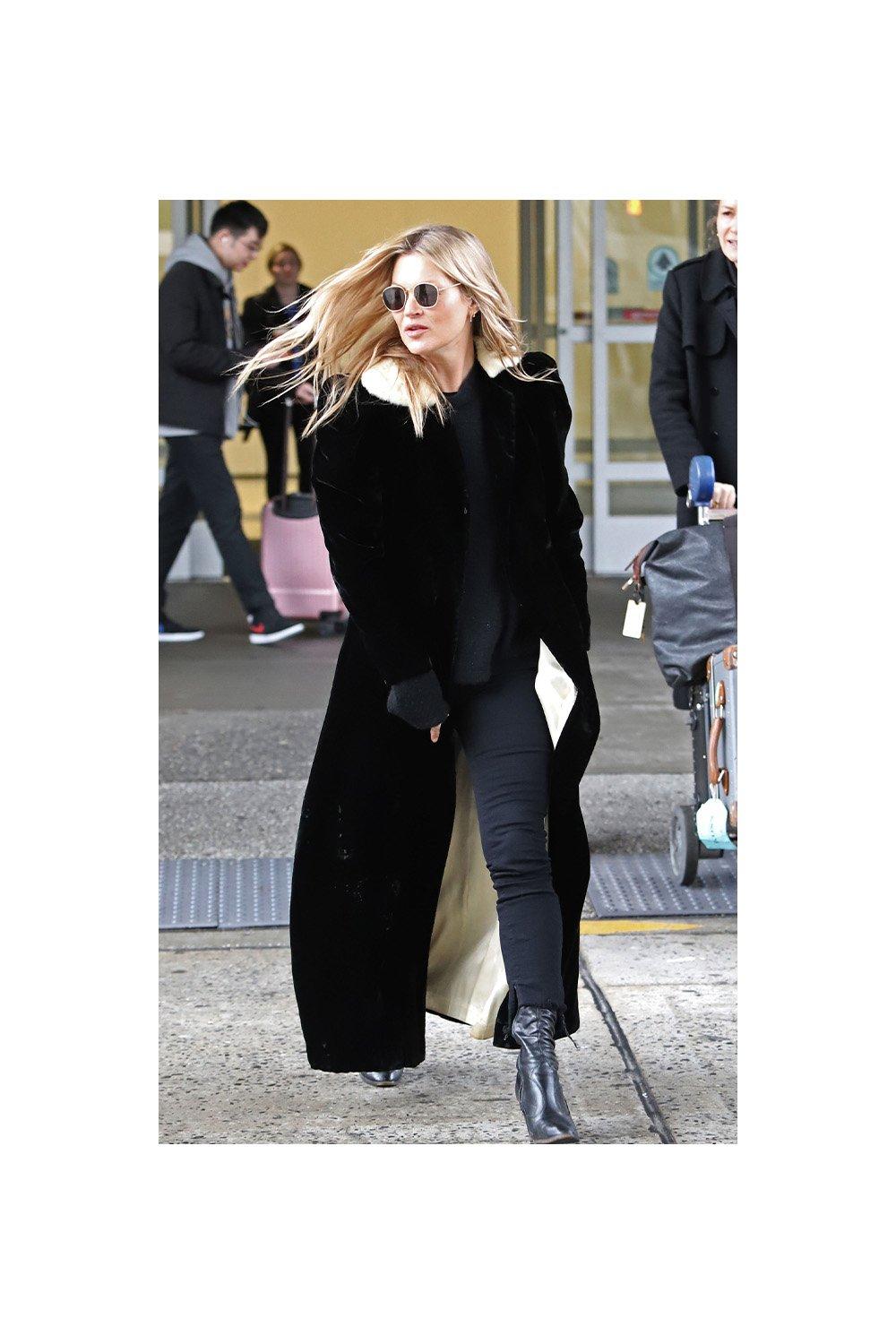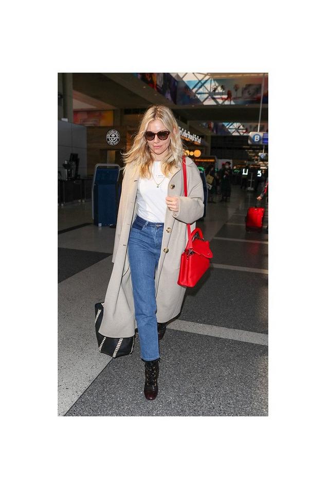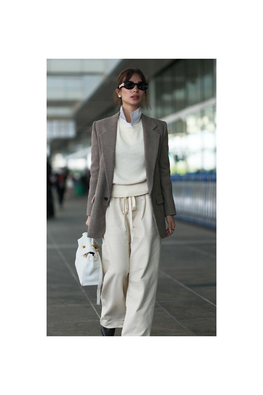 Think neutral palette, clean lines, no fuss. Cream, camel, stone, and black work together without effort and look intentional even when thrown together at the last minute. Anine Bing does this particularly well, relaxed, understated, always editorial. To look classy on the plane, stick to tones that work together naturally, add one structured layer (a blazer, a trench, or a longline cardigan), and finish with deliberate accessories: a Coach leather tote, a pair of oversized sunglasses, a delicate gold necklace that clears security without drama. Simple, considered, done.