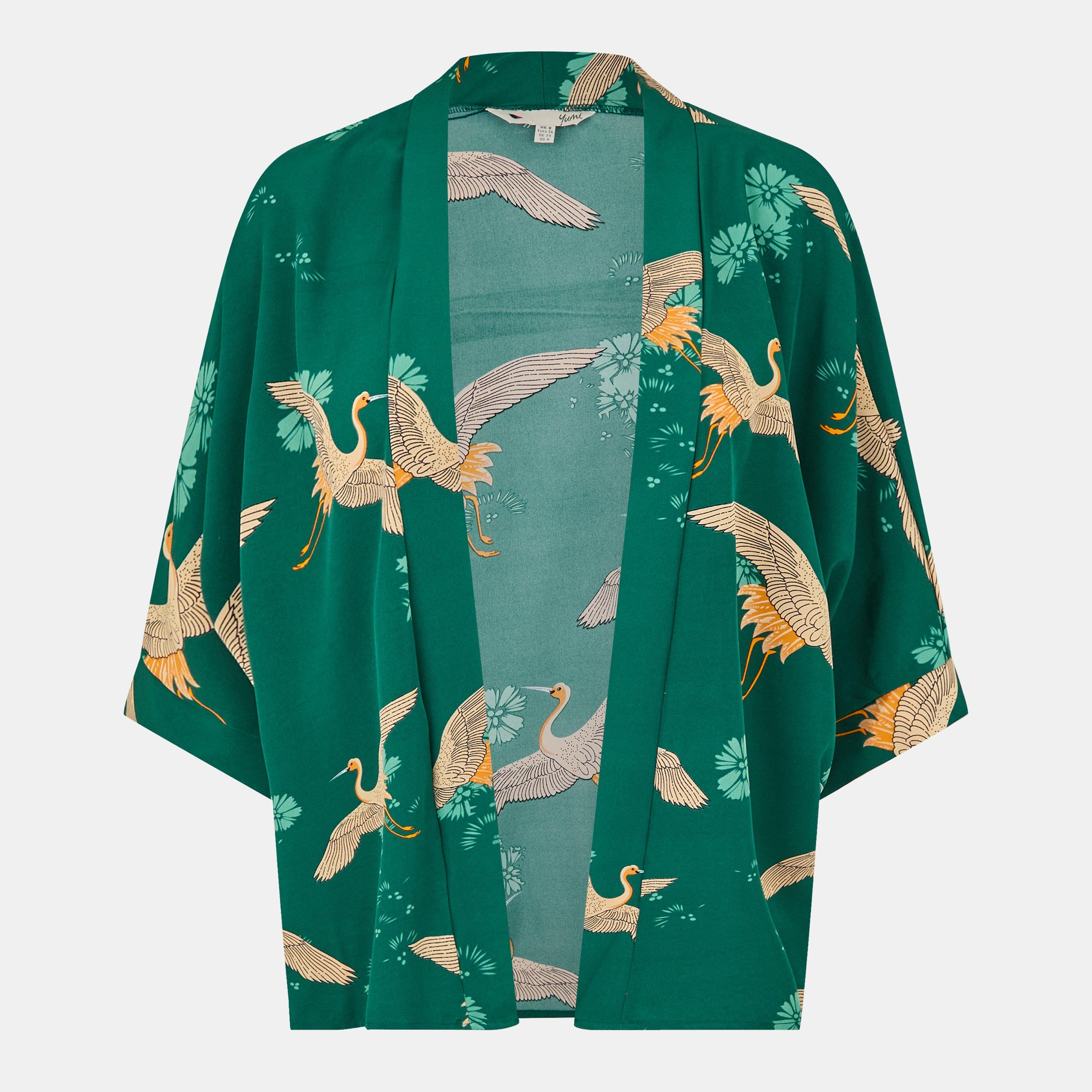 Women's Green Crane Print Kimono Lightweight Overcoat
