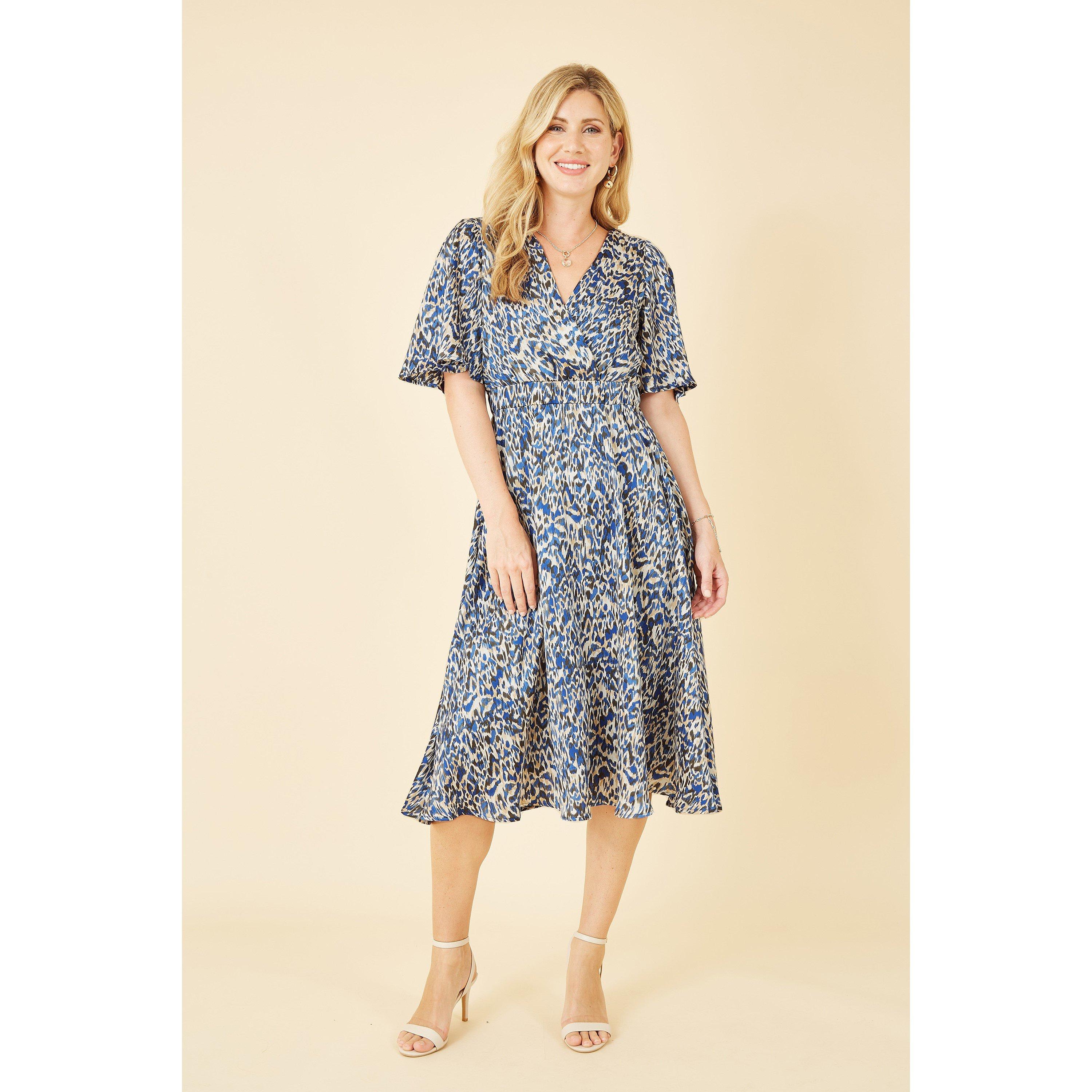 Blue Animal Print Wrap Midi Skater Dress