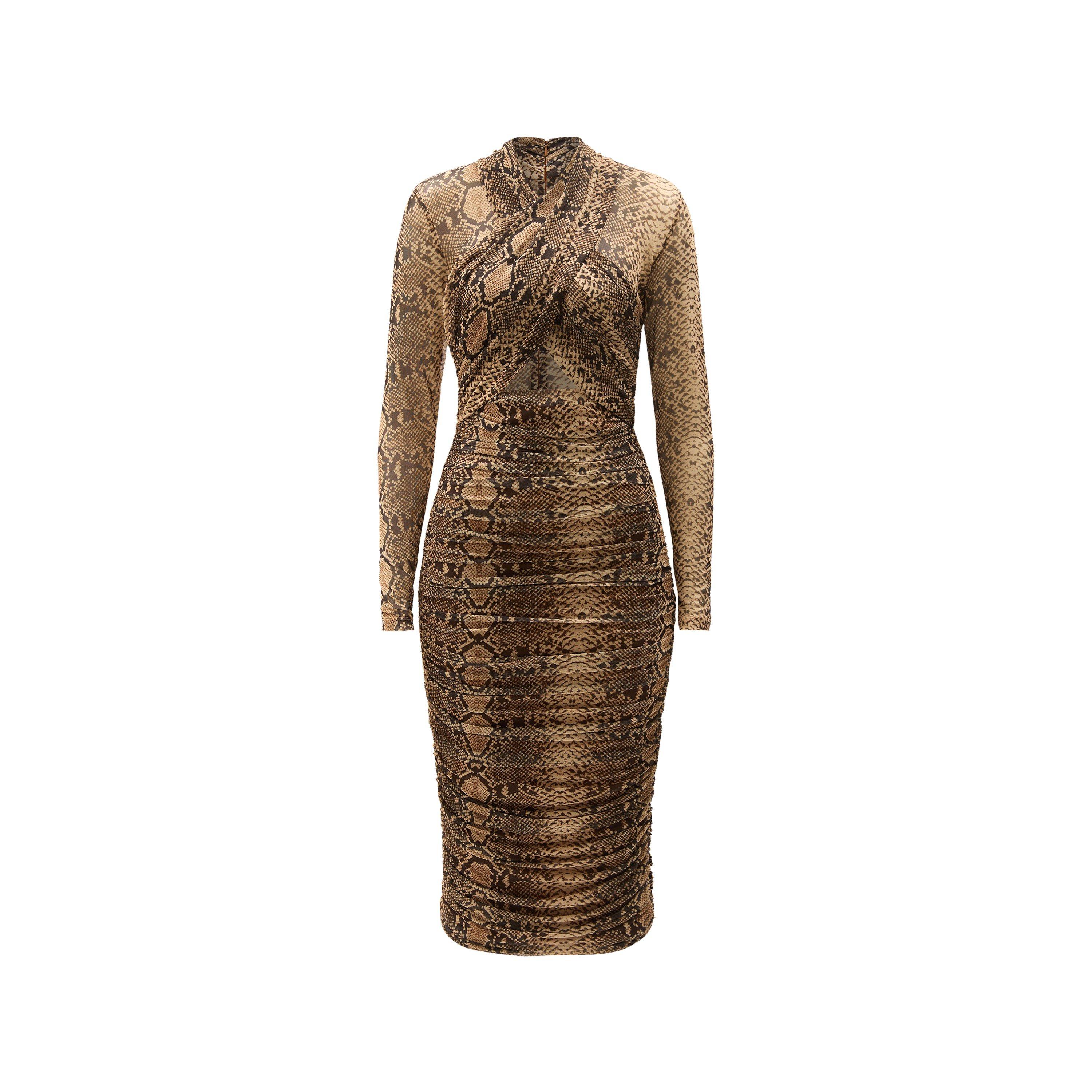 Rust Printed Wrap Top Mesh Long Sleeve Bodycon Midi Dress