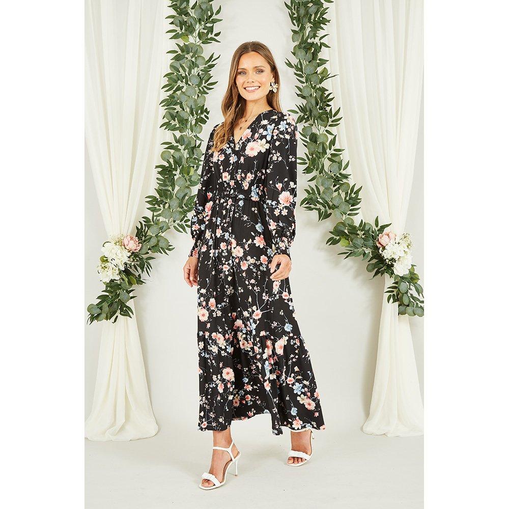 Black Floral Print Ruched Midi Dress