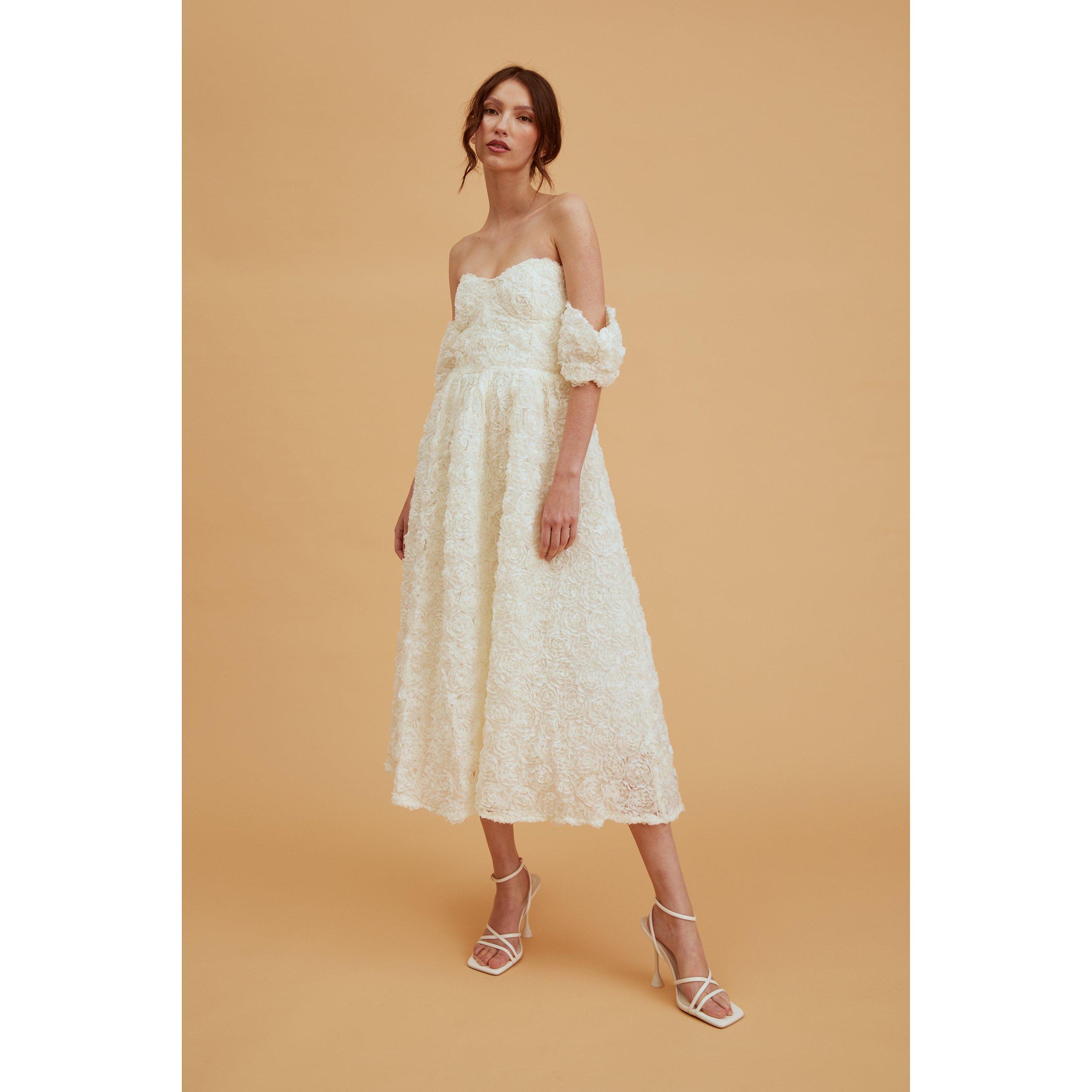 Off-White Brocade Tiered Tie-Back Midi-Dress