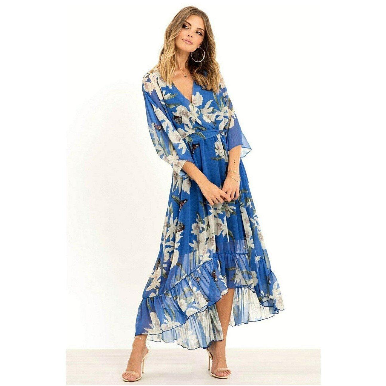 Urban Blue Floral Kimono Midi Wrap Dress