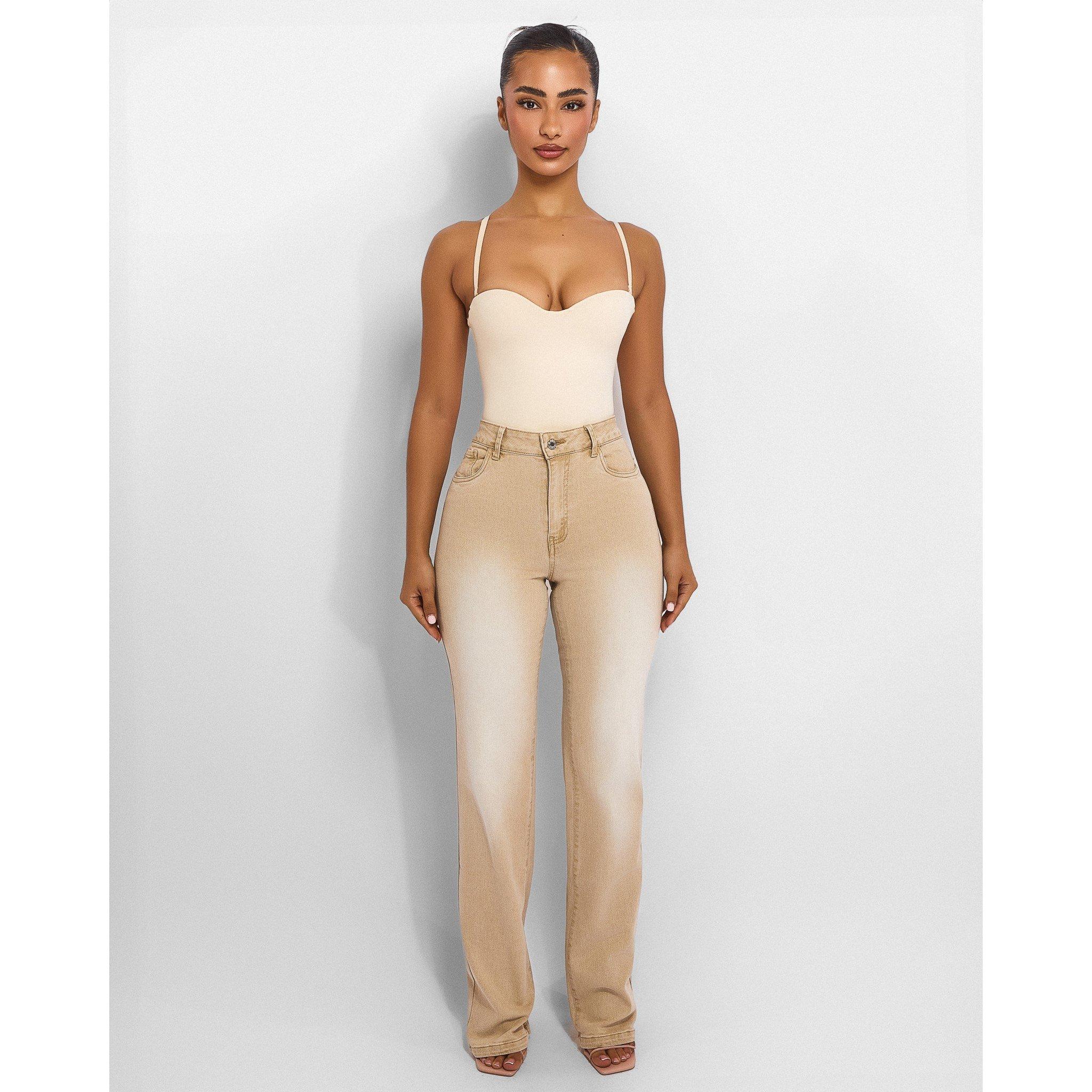 Womens Mom Jeans with Raw Hem Sand