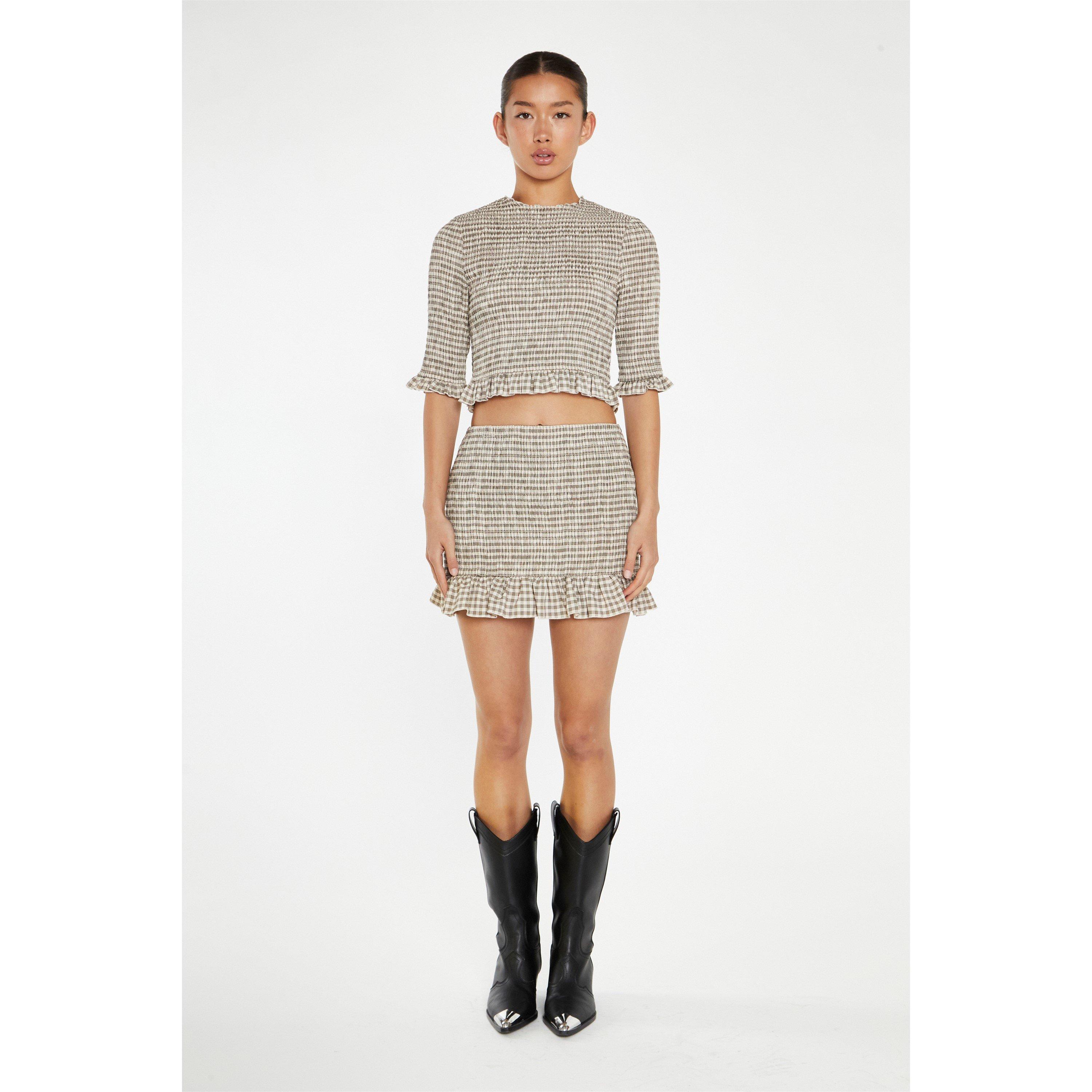 Beige-Black Check Shirred Mini-Skirt
